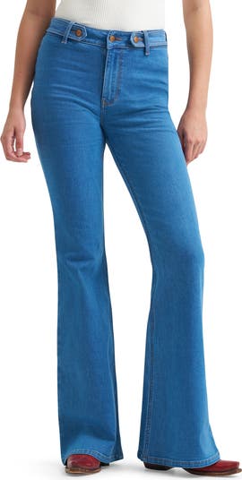 A removable belt amps the modern Western style of these stretchy, flat-front jeans that fit slim through the thighs and flare out into full-length legs.