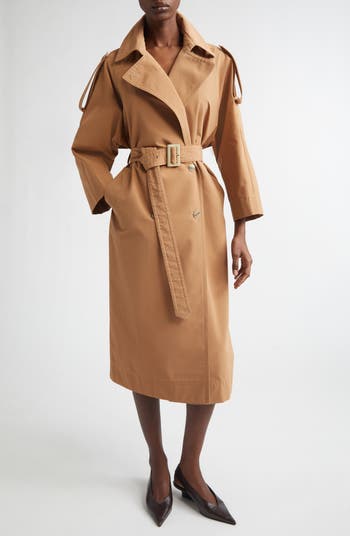 The haute-outerwear label introduces a timeless staple to your capsule wardrobe with this double-breasted trench coat cut from crisp cotton-blend gabardine.