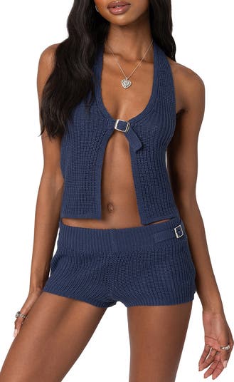 Achieve night-out perfection in this sleek sweater-tank knit in a halter silhouette with an eye-catching open front.
