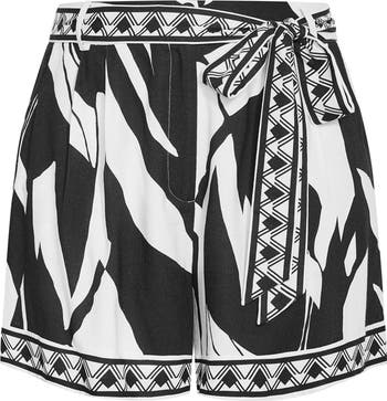 A modern pattern makes a bold statement on these high-waist shorts cinched with a matching tie belt.