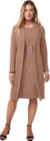 Desk-to-dinner is chicer than ever. This modern dress set features a longline jacket and sheath dress for sophisticated office outfitting. Pair the jacket with a crisp button-down top or wear the dress on its own — the stylish possibilities are endless.