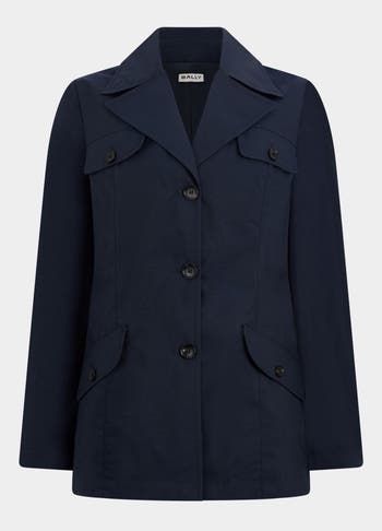 This lightweight navy blue nylon jacket is enriched with four flap pockets, a self-belt with a leather buckle and a notch lapel.