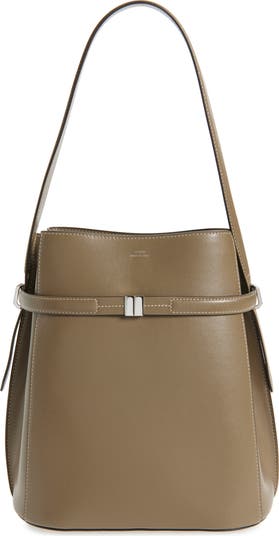 Crafted from smooth leather, this belted bucket bag is designed with a spacious interior in a smartly structured silhouette.
