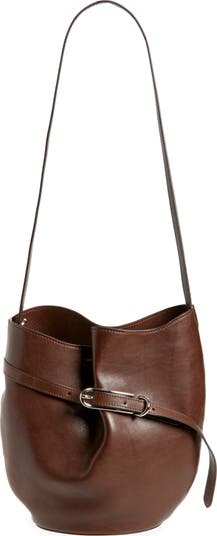 A slender buckle cinches the spacious silhouette of this leather bucket bag that's aesthetic and practical making it a great pick for both workdays and weekends.