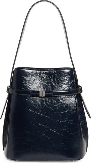 This Italian calfskin-leather bucket bag boasting a crackled, glossy finish and a belt-cinched topline is a reinterpretation of a house-signature silhouette originally debuted on the fall '24 runway.