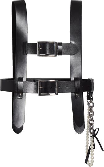 Rocha marries romance and rebellion in this belted leather harness decorated with silvery chains, lustrous faux pearls and a sweet satin bow. This hardware-heavy harness provides a punk-infused counterpoint to the Irish designer's dreamy, frill-flounced designs.