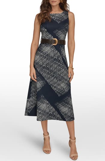 Mixed prints create a bold effect atop this elegant and understated A-line midi dress finished with a belted waist.