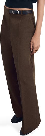 A built-in decorative belt adds a spot of polish to staple pants cut with widened legs.