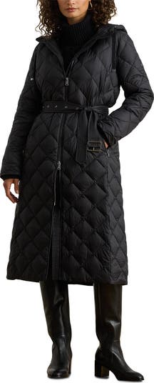 Extra warmth amps up the cozy factor for a diamond-quilted coat shaped with a waist-cinching belt and topped with a roomy hood.