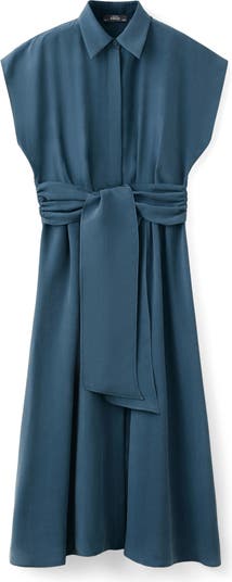 A wide sash adds a grace note to a polished shirtdress topped with a smart collar and ready for desk days and drinks dates.