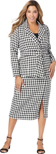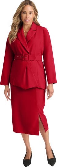 Take workwear to a new level of sophistication with this 2-piece suit featuring a belted surplice jacket with asymmetrical hem atop a classic straight skirt. This modern suit means business — pair with your favorite pumps or boots for statement style