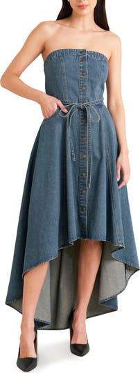 A slender tie defines the waist of this shoulder-baring midi cut from faded denim and finished with a drapey high/low hem.
