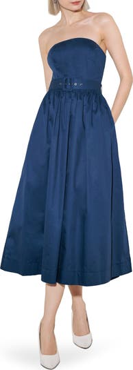 Cut from crisp poplin, this shoulder-baring midi is centered with a wide defining belt and finished with a flared skirt that's perfected with pockets.