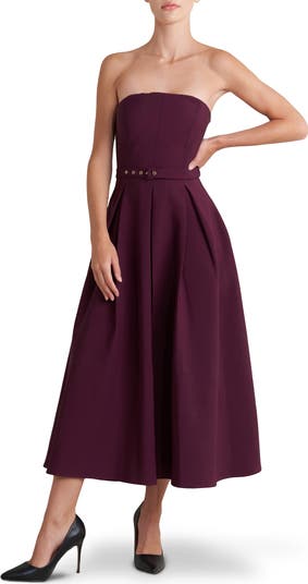 A slender belt defines the waist of this charming shoulder-showing midi finished with a flowy fairytale-like skirt.