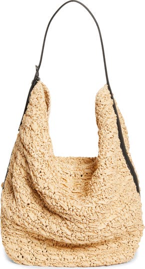 This ample and effortless tote bag crafted in Italy from paper raffia has a substantial handfeel and is designed to drape naturally along the body. It has an adjustable strap with a gleaming silvertone buckle and opens with a small bridge clasp to a spacious interior with divided wall pockets.