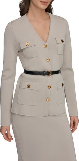 High-shine buttons elevate this sophisticated longline sweater-blazer made with a slender defining belt.