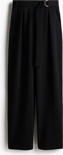 Tailored trousers in jersey featuring a high waist with concealed elastication, a fake fly and a sewn-in belt with metal D-rings at one side. Tapered legs with pleats at the front for a flattering silhouette.