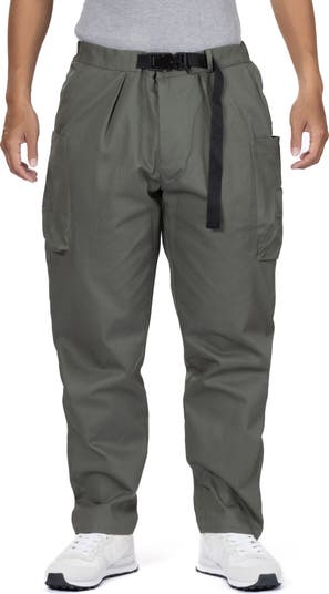 Front pleats emphasize the boxy, relaxed feel of durable cotton-twill cargo pants topped by an elastic waist with a webbed belt for a comfortable fit.