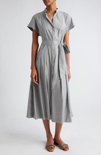 A virgin wool–blend channels the label's elevated ease on a belted shirtdress designed with an elevated mandarin collar and a hidden placket.