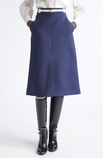 The label's penchant for masterfully tailored creations shines through the silhouette-cinching leather belt built into the waistband of this slitted A-line skirt crafted from a rich blend of virgin wool and silk.