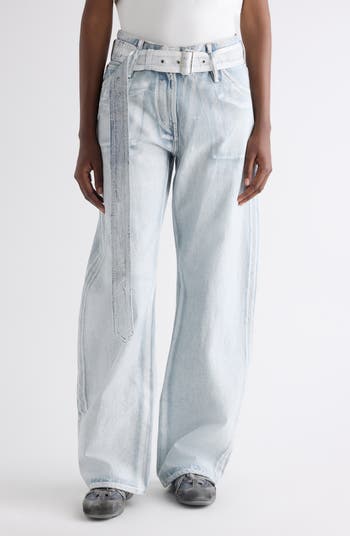 A bleached-out wash highlighted with white paint on the seams and creases creates a 3D effect on these nonstretch-denim jeans cut in a wide-leg silhouette with an extra-long belt detailing the waist.