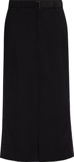 Chitose Abe puts her hybridized spin on traditional tailoring with this pencil skirt cut from wool suiting fabric spliced with glossy satin tuxedo stripes—all tied together with webbed belt.