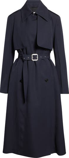 The German designer's signature minimalism shines through the rich wool construction and clean double-breasted silhouette of this trench coat cinched with a buckled belt.