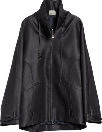 This lustrous wool-and-silk coat featured on the spring '26 runway is fashioned with a high flared collar and a sleek belt wrapping around the neck. It's shaped in an oversized cocoon shape with partial dolman sleeves and tailored with modernistic, angular welt pockets.