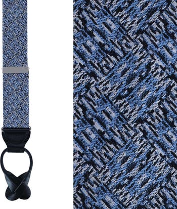 Elevate your formal and business attire with Benito's Blue Basket Weave Pattern Silk Novelty Button End Braces. Crafted in the United States with precision and elegance, these braces combine functionality with a touch of sophistication. Made from luxurious silk with a refined basketweave pattern in a rich blue, black and white hues, these braces offer a sleek and polished look. The novelty design adds a subtle yet stylish flair, making them perfect for both special occasions and everyday wear. Fully adjustable straps provide a custom fit, making them ideal for various body types. Pairs effortlessly with dress shirts, trousers, and suits, adding a touch of personality to your ensemble. Whether you are attending a formal event or adding a distinguished touch to your workday attire, these handsome braces are a timeless accessory that embodies class and style. Adjustable from 33 to 48 inches.