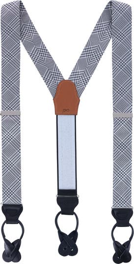 A houndstooth-patterned glen plaid brings smart, classic detailing to suspenders crafted from soft silk to add polish and distinction to any formal look.