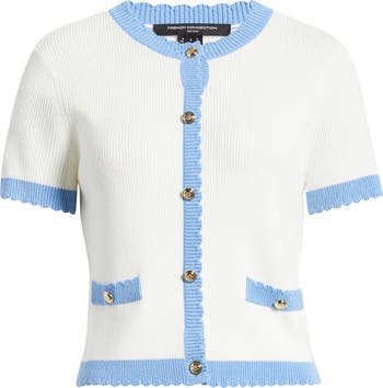 Fine allover ribbing enhances the close fit of this scallop-trimmed cardigan accented with high-shine golden hardware.