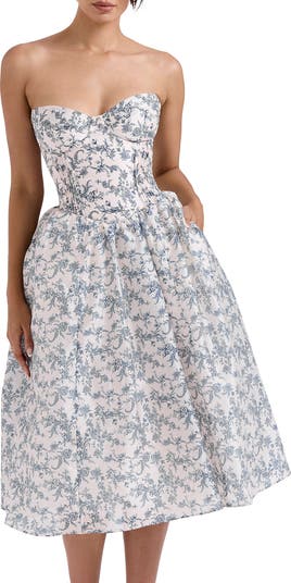 Charm endlessly in this bloom-printed fit-and-flare dress designed with a corseted bodice and a tulle-lined skirt.