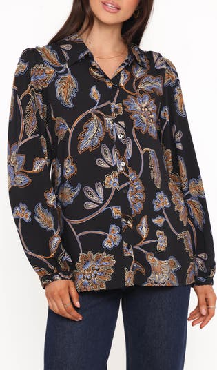 Billowy sleeves enhance the blousy fit of this light and lovely button-up shirt covered in an enchanting floral print.