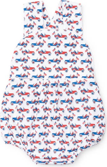 Boys cross back sleeveless bubble. Snap closure on back at straps and three snaps in the stride. Gathered elastic waist in the back. Made from 100% Peruvian Cotton.
