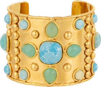 Gold plated brass cuff "Berbere" -Vibrant and eye-catching, this wide gold cuff is adorned with colorful gemstones and bold beading. A true statement piece, it brings a luxe, bohemian touch to any look.