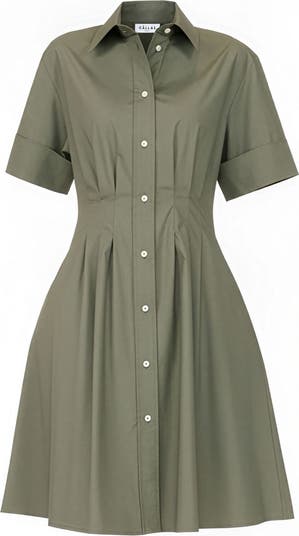 Bergamo is an above the knee dress with seamed waist for a fit and flare silhouette. Featuring wide turn up cuffed short sleeves.