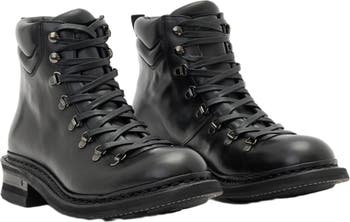 This rugged hiking boot with distinctive alphine detailing and gunmetal hardware is designed for performance. Made in Italy from washed, hand-polished calfskin with lamb leather accents, it has a cushioned collar and tongue for comfort. The heritage rubber sole with alpine tread is finished with Goodyear welted construction for lasting durability.