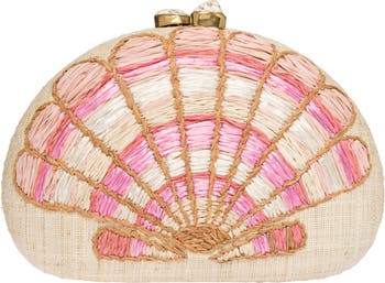 Dome clutch in natural raffia embroidered with a fan shell. Ivory stone clasp closure. Lined with slip pocket and drop in gold chain shoulder strap.