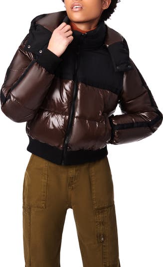 Matte and shiny finishes add style points to a staple puffer jacket made from a feel-good recycled fabric that resists wet weather.