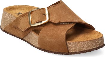 Adjustable suede straps fasten with a gleaming buckle closure on this cork wedge sandal grounded by Soft-Air technology engineered for shock absorption and lasting comfort.