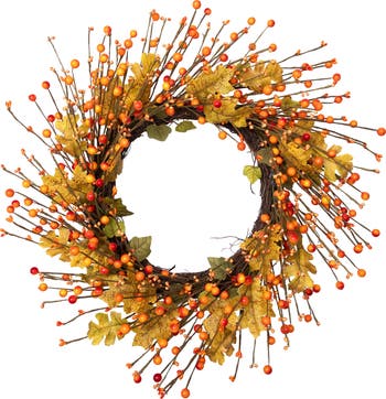Celebrate the beauty of autumn with this vibrant 22-inch artificial Fall harvest wreath, designed with classic seasonal charm. Featuring rich, shiny orange and red berry branches and a mix of traditional and snakebark Maple leaves, this wreath brings the warm, colorful essence of Fall into your home. Crafted on a sturdy natural grapevine twig base, it’s ready to hang straight out of the box—no assembly required. Perfect for indoor decoration on doors, walls, mantels, or covered porches, this Fall wreath complements Thanksgiving décor, Autumn garlands, table centerpieces, and seasonal floral arrangements. Its unlit design allows for personalized styling with mini or fairy lights, burlap bows, ribbons, or other autumn-inspired decorative accents. Ideal for Thanksgiving, harvest celebrations, or full-season autumn decorating, this artificial wreath is built to last when used indoors or in covered outdoor areas, keeping its vibrant Fall colors year after year. Bring seasonal warmth and festive charm to your home with this classic berries and Maple leaves Fall harvest wreath. Product Features: Shiny red and orange berries Showcases a blend of traditional and snakebark Maple leaves Natural grapevine twig backing for easy hanging Recommended for indoor use - if using outdoors, place under a covered area No assembly required – wreath comes in 1 piece Dimensions: 22" diameter (measured from outermost tip/edge to outermost tip/edge across the wreath) Material(s): polyester/wire/foam/plastic