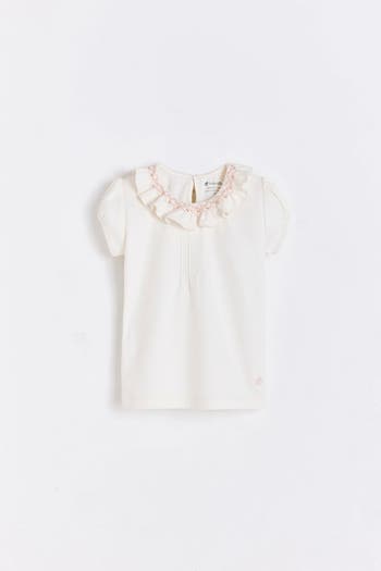 Short sleeve t-shirt mande with soft Pima Cotton. Smock detail and flutter around the necklace. Button at the back for easy fit. Logo embroidered at the front.
