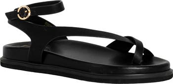 A single toe loop and adjustable ankle strap deliver a secure fit on a faux-leather sandal grounded by a cushioned footbed and grippy rubber sole.