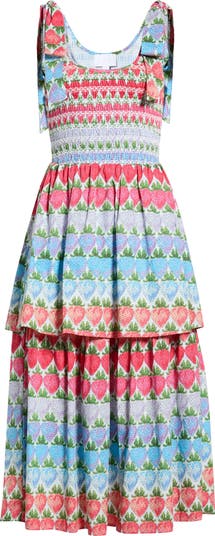 Berry-bright and summer-ready, this charming midi pops with a colorful tiered skirt. A fitted smocked bodice and adjustable tie-shoulder straps personalize the fit, while pockets make it as practical as it is pretty.