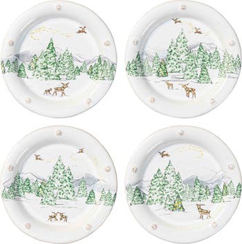 Juliska's iconic Berry and Thread motif details a set of snowy ceramic cocktail plates hand-illustrated with festive holiday scenes of Santa's North Pole.