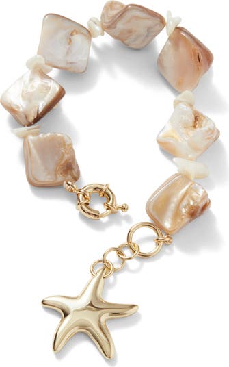 Lustrous shell beads bring the organic beauty of the sea to this bracelet anchored with a gleaming starfish charm.