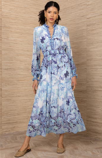 Crafted from lightweight washed chiffon, this midi dress features a flowing silhouette with a softly smocked waist, long sleeves, and a tiered skirt for added movement. Finished with a refined allover print, it delivers effortless elegance from day to evening.
