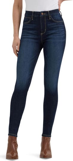 A high rise and contoured waistband eliminate gapping and offer a flattering silhouette on full-length skinny jeans rendered in a stretch-enhanced cotton blend for added flexibility and shape retention.