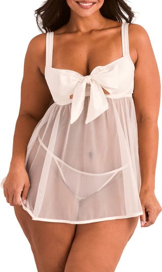 This babydoll features a giant bow that literally "unwraps" to reveal unlined cups and the presents underneath! It also has fully adjustable straps and a hook and eye closure, plus it comes with a matching g-string panty.