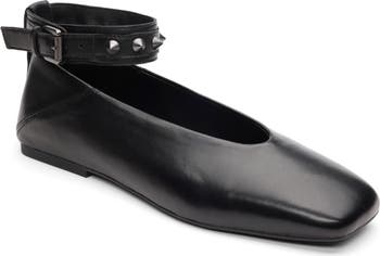Spiky brushed studs guard the ankle strap and heel of this striking square-toe ballet flat that mixes soft with edgy.